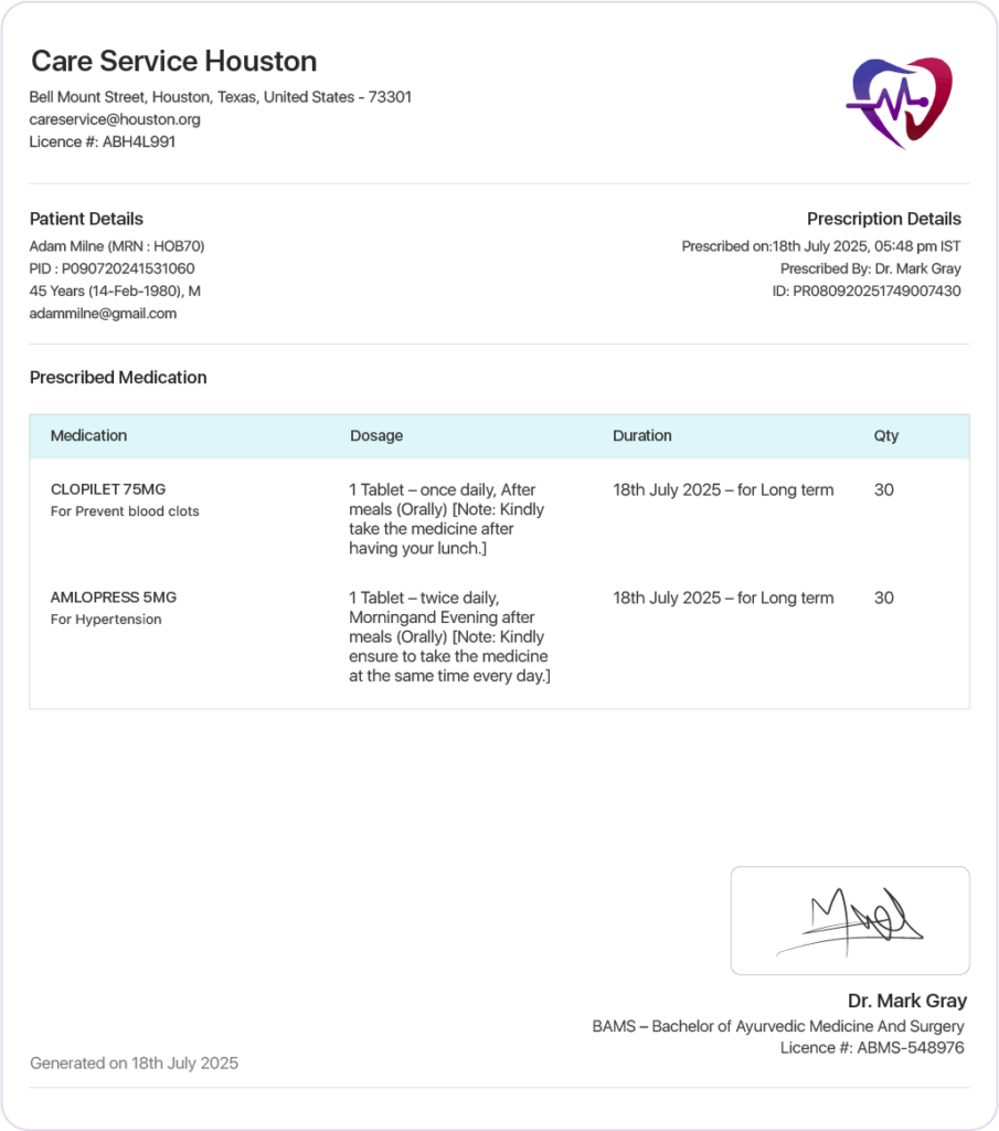 You can easily create medical Prescriptions for patients, whether they are consulting with you online or visiting your clinic. Prescriptions can be saved digitally for future reference or printed on your clinic’s letterhead.